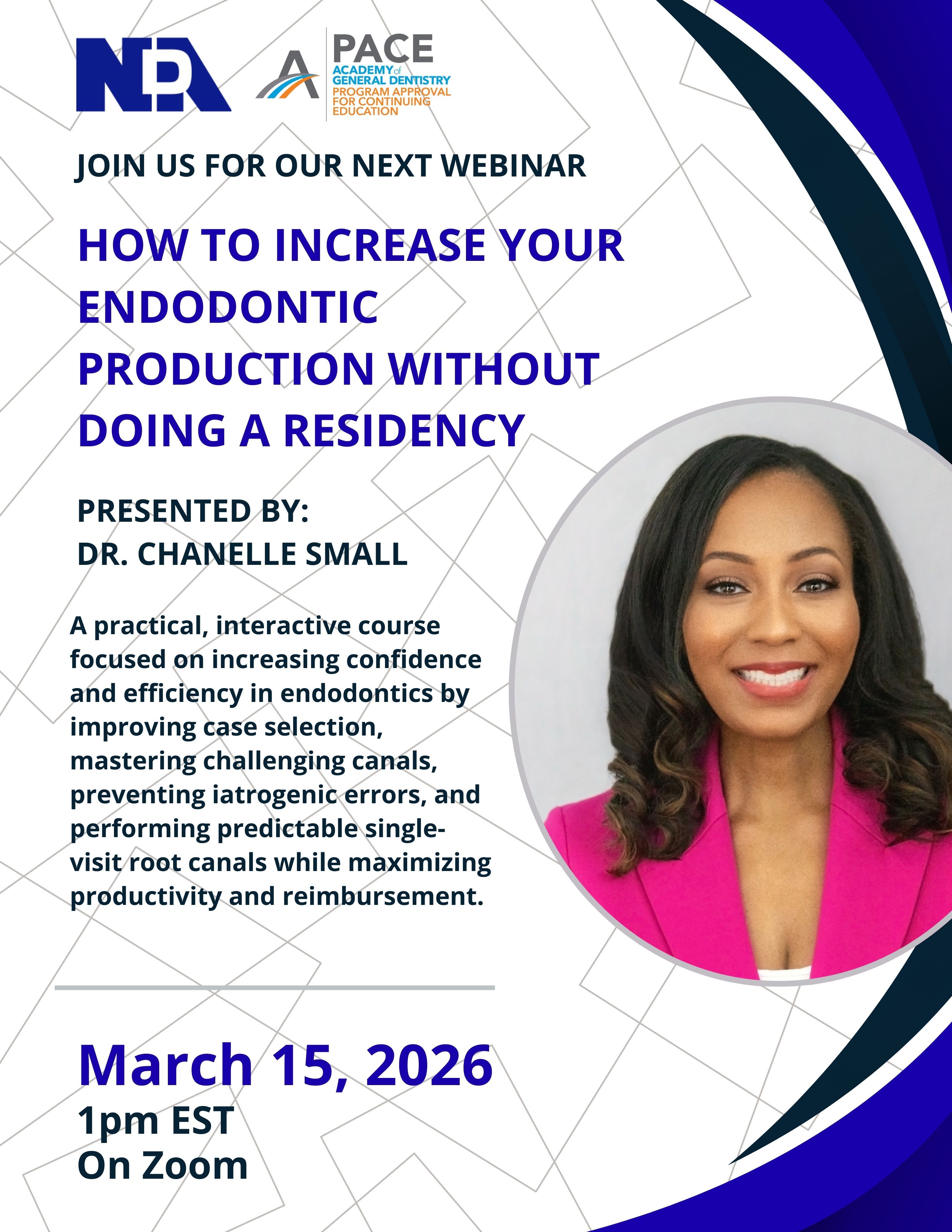 In this course we will discuss how to increase office revenue by doing more root canal cases faster and more efficiently. This practical and interactive course will review strategies to perform root canals in a single visit with predictable outcomes. We will delve into techniques to help you consistently reduce chair time to perform endo more safely so you can take on cases you couldn’t in the past. Gain confidence with easy tips that can make a difference between a successful and a failed root canal. We will conclude with an overview of insurance billing strategies to maximize reimbursement.